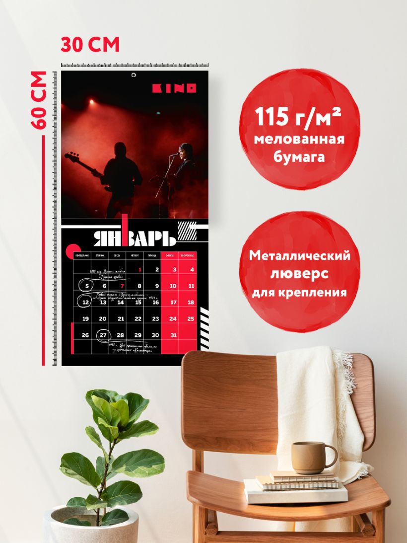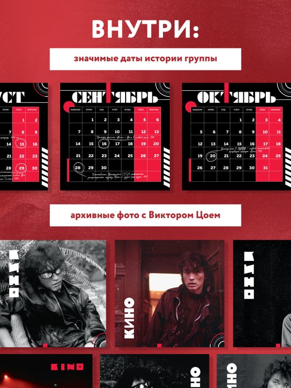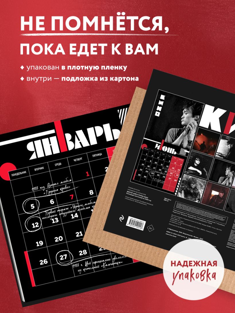Подарок для поклонников группы «Кино» и ценителей советской эстетики. Эксклюзивный тематический настенный календарь с редкими архивными кадрами Виктора Цоя. Отличное полиграфическое исполнение, удобная сетка, большой формат и стильный макет, в котором отмечены важные даты, связанные с историей рок-группы: дни рождения участников, даты выхода альбомов, ключевые концерты и даже день, когда в СССР было запрещено распространение ее музыки…