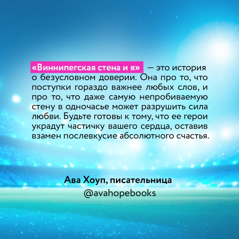 «"Виннипегская стена и я" — это история о безусловном доверии. Она про то, что поступки гораздо важнее любых слов, и про то, что даже самую непробиваемую стену в одночасье может разрушить сила любви. Будьте готовы к тому, что ее герои украдут частичку вашего сердца, оставив взамен послевкусие абсолютного счастья». — Ава Хоуп, писательница, @avahopebooks