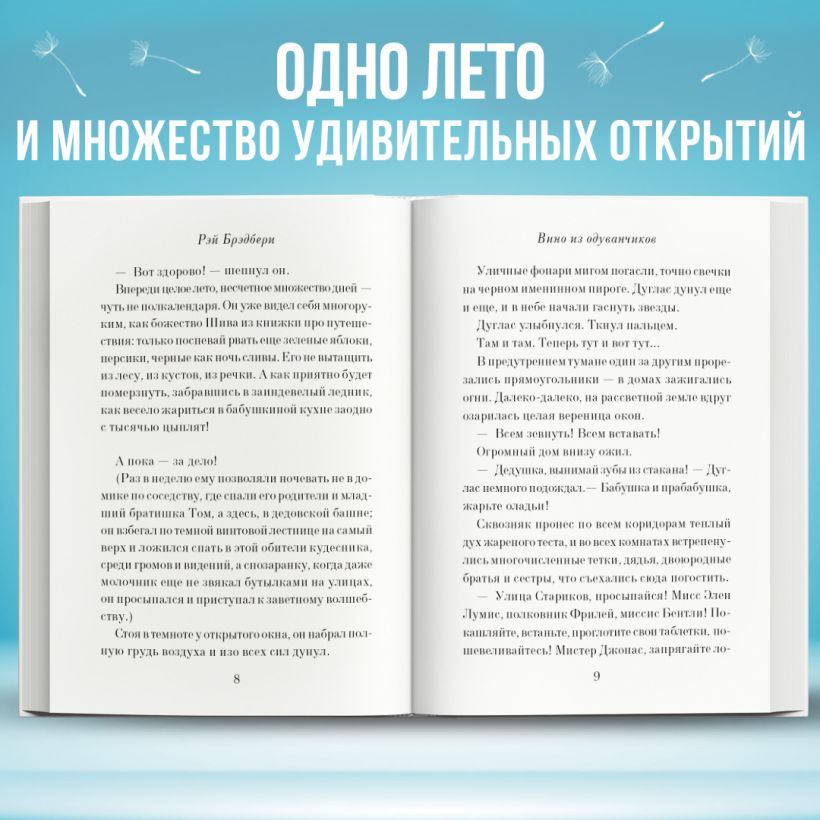 Эту книга можно перечитывать снова и снова, причем в любое время года, но лучше, конечно, летом, и тогда образы, картины, возникающие в голове, можно будет наблюдать и в реальности, проживая с главным героем все его летние приключения. Брэдбери настолько потрясающе, проникновенно и детально описывает природу, обстановку домов, что начинаешь ощущать аромат летнего сада, сырость леса, дуновение ветра или отдаленные раскаты громы. В книге рассказывается о простых вещах, которые мы можем наблюдать ежедневно, но порой даже не обращаем на них внимания. А ведь в этом как раз главное - научиться радоваться привычному, жить каждую секунду, т.е. не просто убивать время на существование, а по-настоящему ЖИТЬ, чувствовать. При этом автор показывает, что счастье невозможно создать с помощью машин, потому что оно все равно будет иллюзорным. Также нельзя удержать людей, которые тебе дороги, рядом. В романе порой возникают такие грустные моменты, хотя в целом его можно назвать добрым и светлым, позволяющим переосмыслить в некоторой степени свою жизнь. И хотя между летом 1928 и лето 2012 прошло почти 100 лето, главные ценности остались такие же. А уж что для кого главное, каждый пусть решает для себя. Единственное, несмотря на всю простоту и легкость изложения, порой бывает нужно время на привыкание к стилю Брэдбери. На это может уйти от 5 до 10 страниц, но потом "Вино из одуванчиков" можно проглотить на одном дыхании.