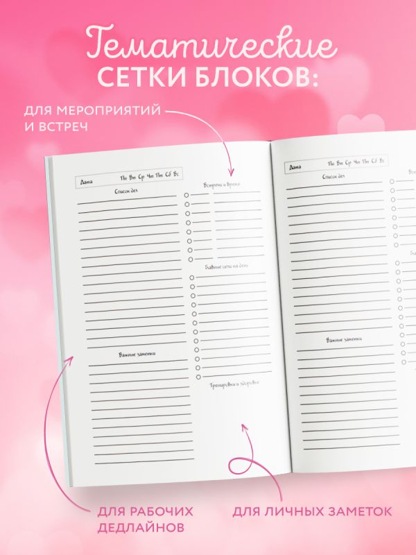 - Сетка блока создана с учетом современных тенденций европейского дизайна: часть распределена по времени — для ваших рабочих дедлайнов, а другая часть — линейки, которые можно использовать как для личных заметок, так и для планирования рабочих задач.