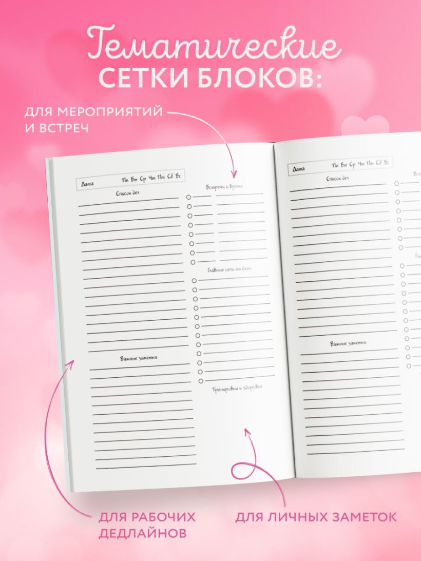 «К себе нежно» — это ежедневник от автора одноименного бестселлера. Он не про успешный успех и карьерную мотивацию, он — про бережное отношение к себе, про то тихое и нежное, что у вас внутри. С помощью этого ежедневника вы не только сможете помнить о предстоящих делах и задачах, но и обретете верного друга, который будет от страницы к странице обнимать вас словами. В ежедневнике вас ждут: • блоки для записей дел на будни и выходные; • «обнимательная» фраза-напутствие на каждую неделю; • цитаты из книги «К себе нежно»; • рубрика «Важно» для записи задач, требующих особого внимания; • рубрика «Чем я себя порадую?», куда можно вписывать все то приятное, что вы собираетесь сделать для себя; • трекеры для двух привычек; • необычный вопрос на «подумать» и «почувствовать» — для самопознания и исследования своих глубин; • трекер жизненного изобилия, который поможет убедиться: ваша жизнь намного богаче и интереснее, чем кажется; • «носочек накоплений», помогающий следить за тем, как копятся деньги на мечту; • раскраски, которые помогут развеяться, отвлечься или просто занять руки во время скучного совещания :) • и другие авторские материалы.