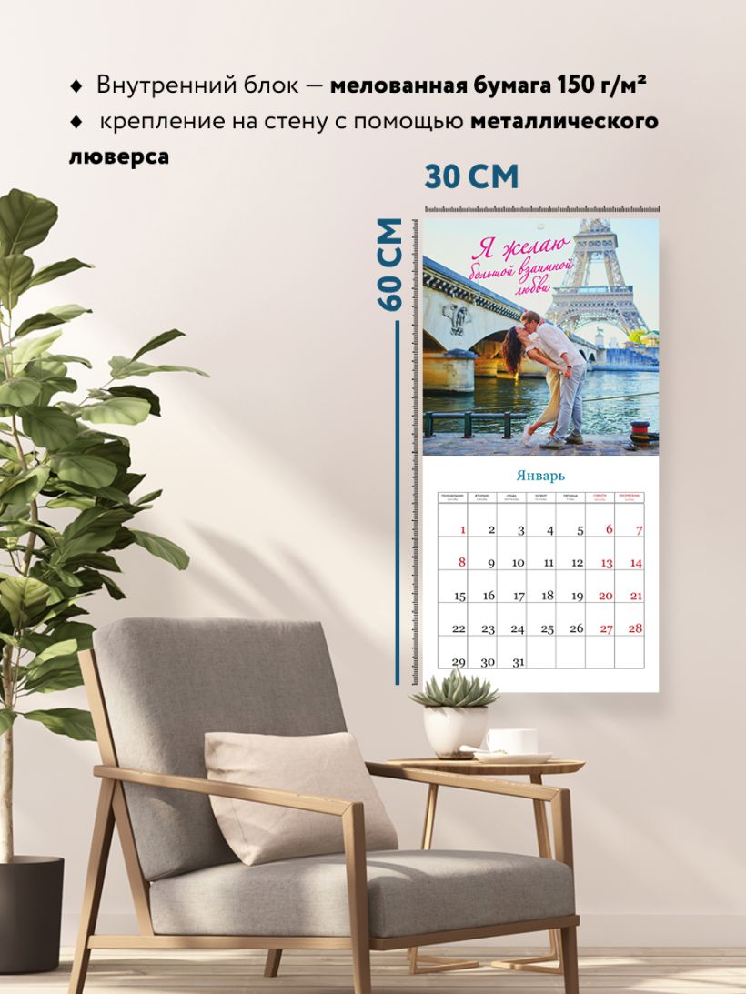 Благодаря большому формату и высокому качеству изображений этот календарь может стать отличным дополнением интерьера. В нем также отмечены выходные дни, а просторная сетка позволяет удобно планировать время и записывать важные события.