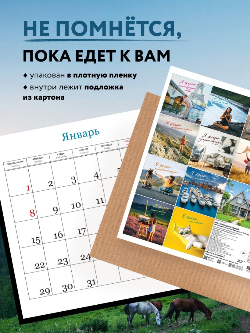 В календаре подобраны красочные фотографии для заряда мотивации и визуализации желаний: вы сможете поставить перед собой невероятные цели и достигнуть их в сопровождении красочных фотографий и аффирмаций. Каждый новый месяц пробудит самые искренние и высокие стремления.