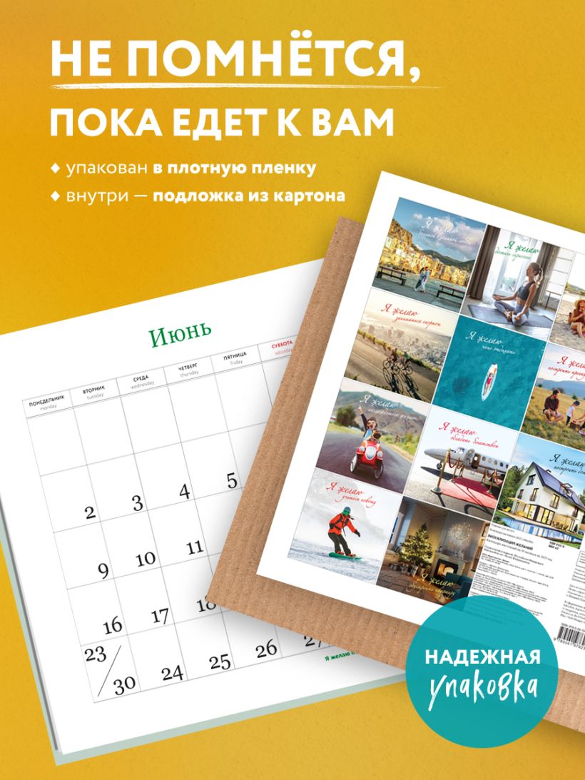 В календаре подобраны красочные фотографии для заряда мотивации и визуализации желаний: вы сможете поставить перед собой невероятные цели и достигнуть их в сопровождении красочных фотографий и аффирмаций. Каждый новый месяц пробудит самые искренние и высокие стремления.