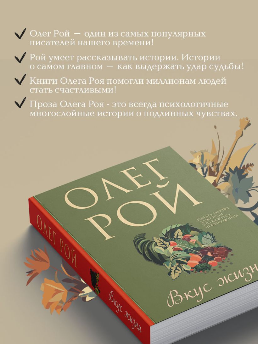 В романе Олега Роя «Вкус жизни» именно так и происходит: практически единственное, что осталось у Наташи, главной героини книги, после того как рухнул ее такой уютный и такой унылый мир, — страстная любовь к кулинарии. Как такое хобби может помочь изменить жизнь? Кардинально. При неиссякаемом упорстве, чуточке везения и хорошей поваренной книге. Главное — почувствовать вкус жизни, и все получится!