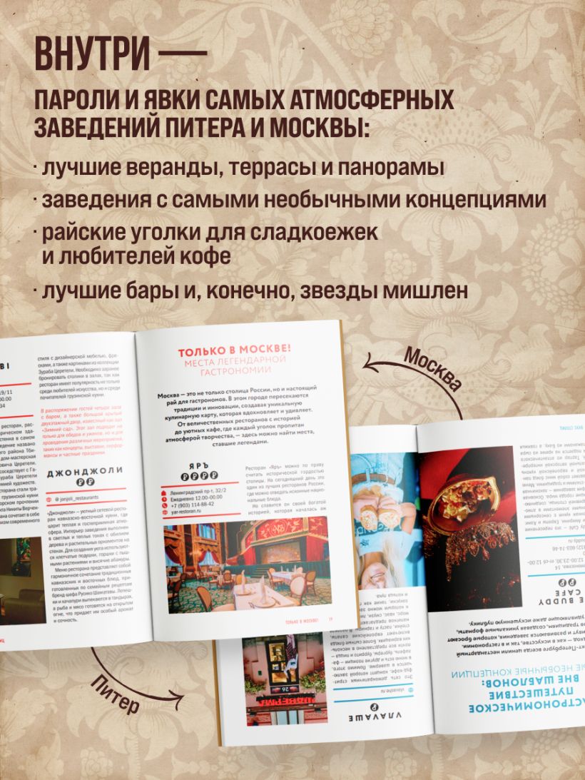 «Вкус столиц» — это уникальная коллекция маршрутов, которая откроет перед вами вкуснейшие уголки Москвы и Санкт-Петербурга. В гиде собрано 11 тематических подборок, которые проведут вас по местам, где культура и кухня переплетаются в самых неожиданных формах. Каждое путешествие по столицам России — это не только дегустация лучших блюд, но и возможность ощутить атмосферу городов с их историей, традициями и современными трендами.
