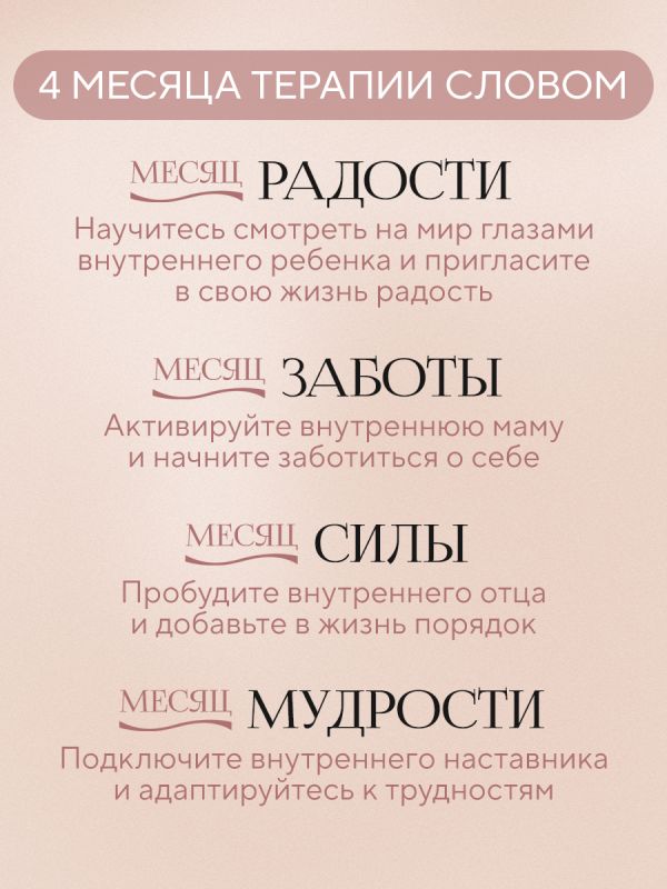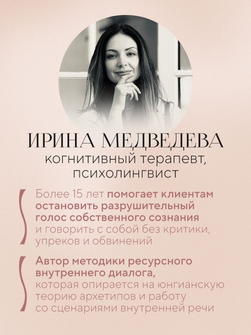 Психолингвист Ирина Медведева создала уникальный путеводитель по ресурсному самообщению, который поможет развить добрый и сильный голос самоподдержки. 4 месяца работы с ресурсными архетипами и их установками станет ключом к бережному внутреннему диалогу, в котором вы будете на своей стороне.