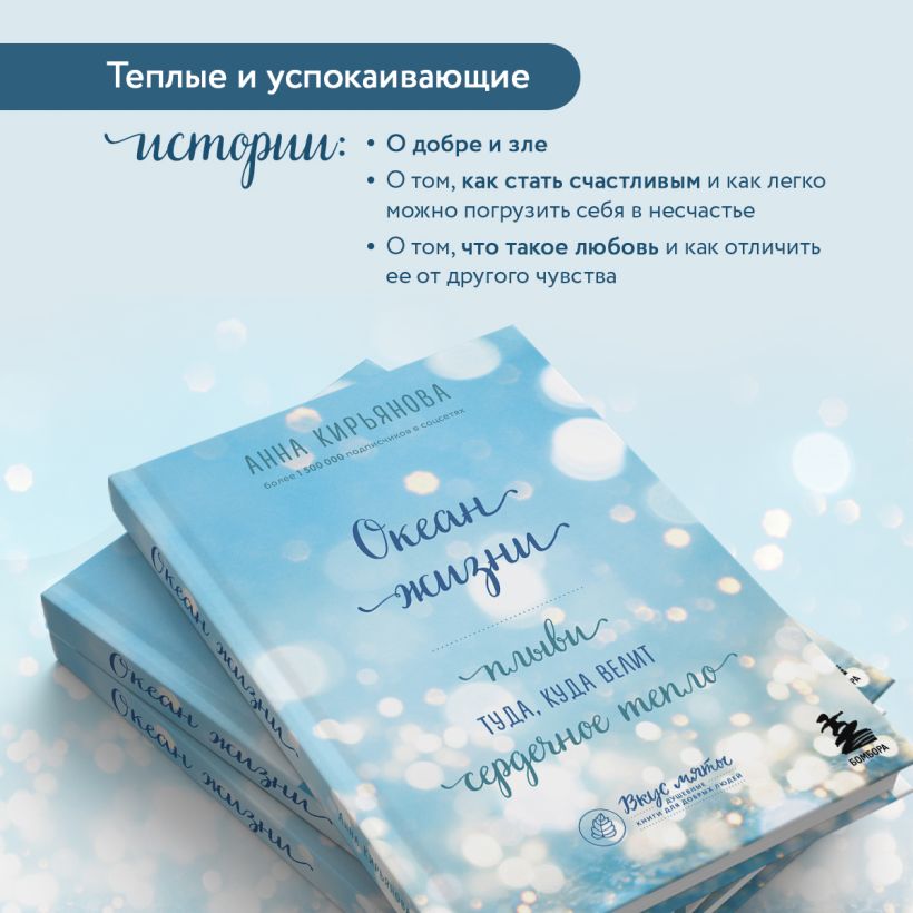 Яркие и незаметные, громкие и тихие, необыкновенные и будничные — из больших и маленьких мгновений, как волны в океане, состоит наша жизнь. Любовь, которая может прийти поздно, но всегда вовремя. Чашечка кофе и роскошный десерт, как полчаса заслуженного счастья. Память о родных, которые не рядом, но ближе всех. И вера в то, что жизнь — это череда падений и чудесных спасений. Терапевтические истории Анны Кирьяновой расскажут о невероятном течении судьбы и напомнят, что самое правильное направление то, которое вы выбрали сердцем.