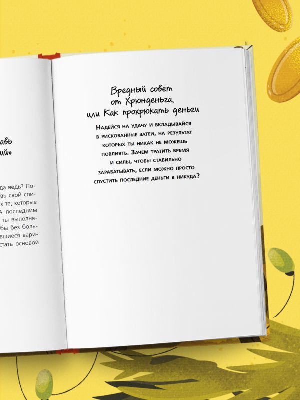 «Вредный совет от Хрюнденьга, или Как прохрюкать спокойствие: Трать все до копеечки, а то вдруг завтра конец света. Многие люди живут и без всякого запаса. Ну... правда, нервно живут. Если случается что-то непредвиденное, они залезают в долги, переживают, перегружают себя работой, ночами не спят. Зато никаких проблем с этими подушками безопасности. Еще не хватало обделять себя в удовольствиях, отнимая от девяти леденцов десятый!»