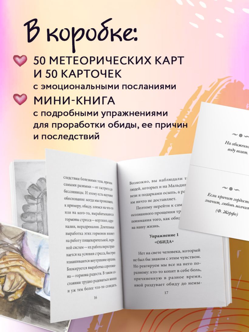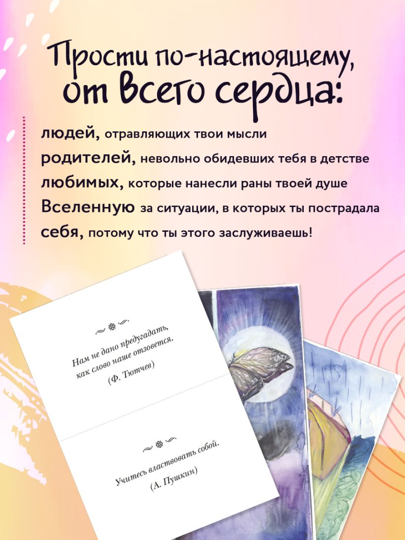«Для тех, кто хочет научиться прощать. Искренне, открыто, честно — по-настоящему. Эта колода карт поможет начать лучше понимать себя и свои чувства в определенных аспектах. Избавление от обид и ощущение легкости от самого настоящего внутреннего очищения — вот что оставляет она после себя». — Смирнова Татьяна Александровна, нейробиолог, андрагог, автор нескольких образовательных проектов