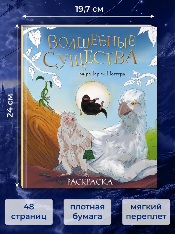 Гордый гиппогриф, мрачный фестрал, коварная русалка, мудрый кентавр. очаровательный нюхль и многие другие фантастические создания из мира Гарри Поттера ждут тебя на страницах этого волшебного издания! У тебя есть уникальный шанс почувствовать себя настоящим магозоологом и поближе познакомиться с диковинными существами, живущими в твоей любимой фэнтезийной вселенной. Заполни своими любимыми цветами чудесные иллюстрации и сделай знаменитую историю еще ближе.