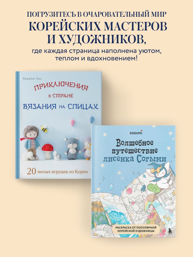 Комплект из книги и раскраски Приключения в стране вязания на спицах. 20 милых игрушек из Кореи и Волшебное путешествие лисенка Согыми. Раскраска от популярной корейской художницы