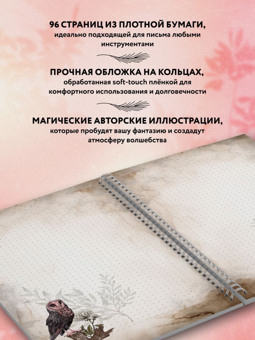 В блокноте 96 страниц из плотной бумаги (80 гм/м2), магические авторские иллюстрации, вдохновленные колдовством, ведьмовской эстетикой и магией природы. Блокнот в точку. Твёрдая обложка на кольцах покрыта плёнкой soft-touch, чтобы дарить ещё больше уюта и заземления в суете мегаполиса.