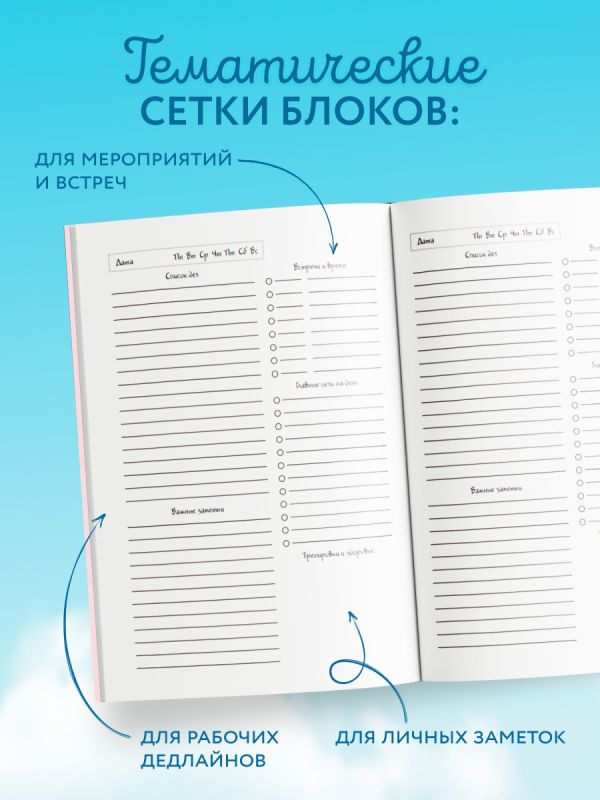 - Сетка блока создана с учетом современных тенденций европейского дизайна: часть распределена по времени — для ваших рабочих дедлайнов, а другая часть — линейки, которые можно использовать как для личных заметок, так и для планирования рабочих задач.