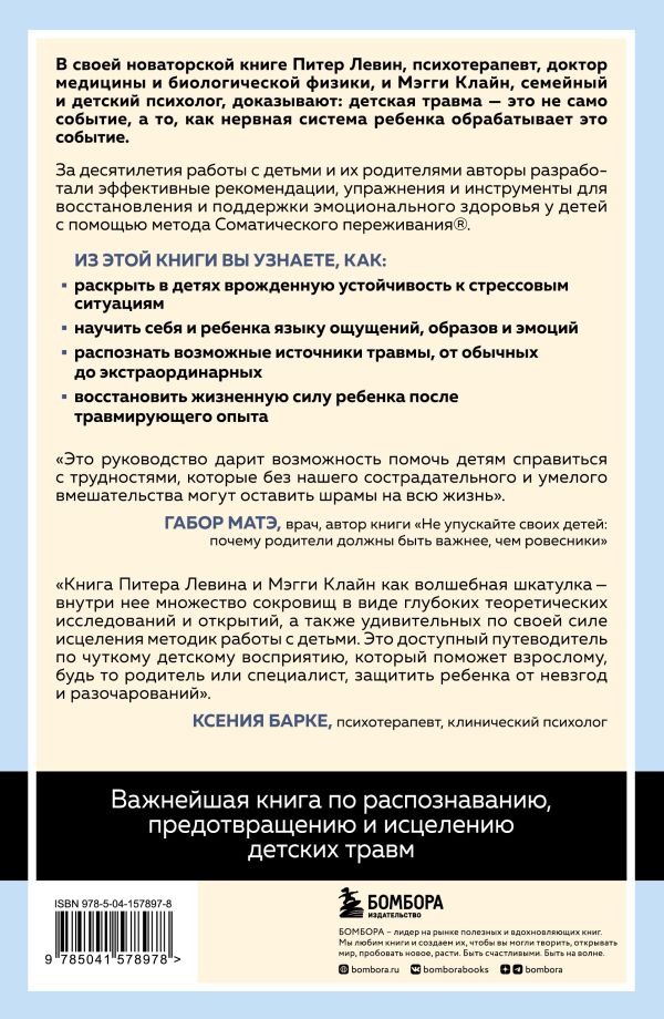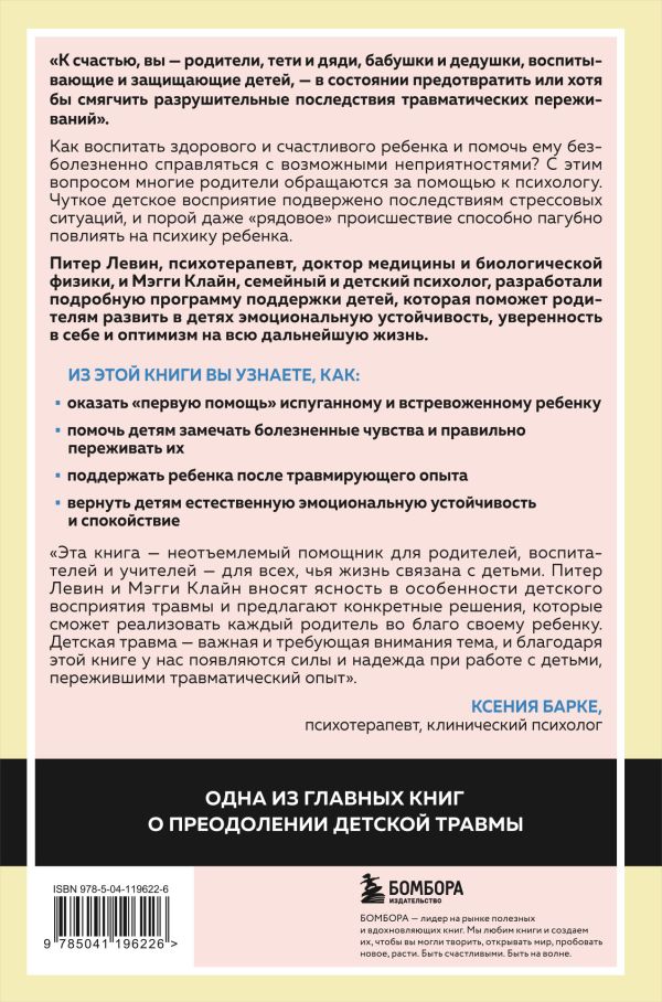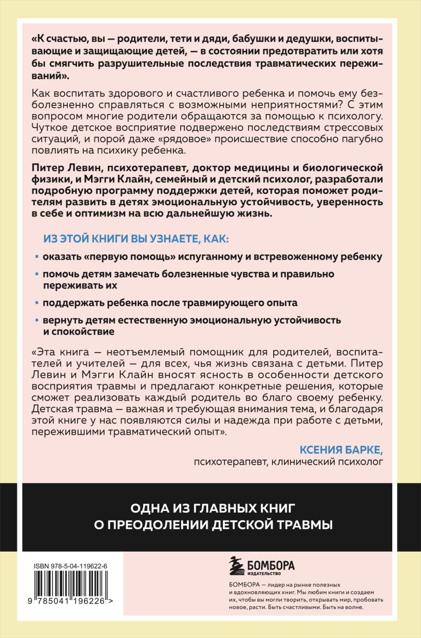 Питер Левин, психотерапевт, доктор медицины и биологической физики, и Мэгги Клайн, семейный и детский психолог, разработали программу защиты детей от травматических последствий «рядовых», на первый взгляд, событий и глубоко шокирующих детское сознание происшествий. Эта книга незаменима как для исцеления детей, переживших травматический опыт, так и для поддержки и консультации самих родителей.