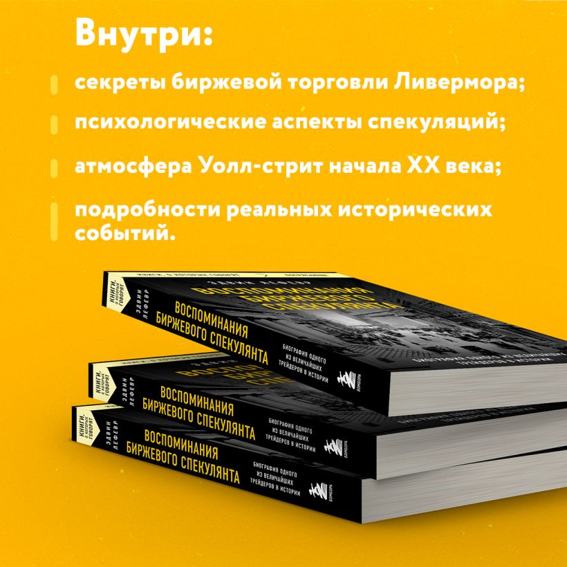 Известные трейдеры современности в один голос заявляют: книга «Воспоминания биржевого спекулянта» стала одной из важнейших в их жизни. Почти 100 лет она регулярно переиздается и заслуженно считается классикой биржевой литературы. Эта книга — художественная биография одного из величайших трейдеров в истории Джесси Ливермора по прозвищу Великий Медведь. Автор рассказывает о пути главного героя начиная с 14 лет, когда он работал в брокерской конторе, до зрелого финансиста, который уже не раз терял и зарабатывал состояние.