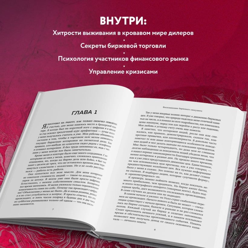 «"Воспоминания..." — это шедевр! Спросите об этом любого ветерана рынков. Эта книга об игре! О приключениях человека, который поднимался, падал, поднимался снова. В одиночку благодаря своей выдержке достиг необычайного уровня мастерства и покорил грандиозные вершины. При этом он был таким же человеком, как и мы. Повествуя о биржевых махинациях, автор между строк размышляет о неизменной человеческой природе. Нащупайте эту нить, и получите от чтения подлинное эстетическое удовольствие». — Ренат Валеев, CFA, трейдер с 15-летним опытом, экс-трейдер в Центральном Банке РФ, автор бестселлера, создатель Telegram-каналов headlines