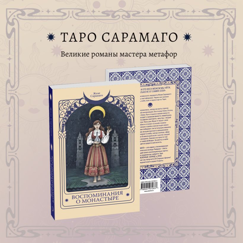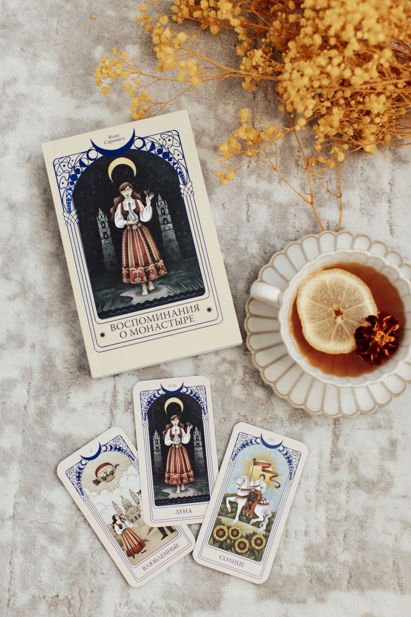 «Таро Сарамаго» — это серия, стилизованная под классическую колоду Райдера — Уэйта. Внутри каждой книги коллекционные карты. В этом издании вы найдете Таро Солнце, Луна и Влюбленные. Собрав все 7 книг, вы получите 22 Старших Аркана! В последней книге серии 4 карты.