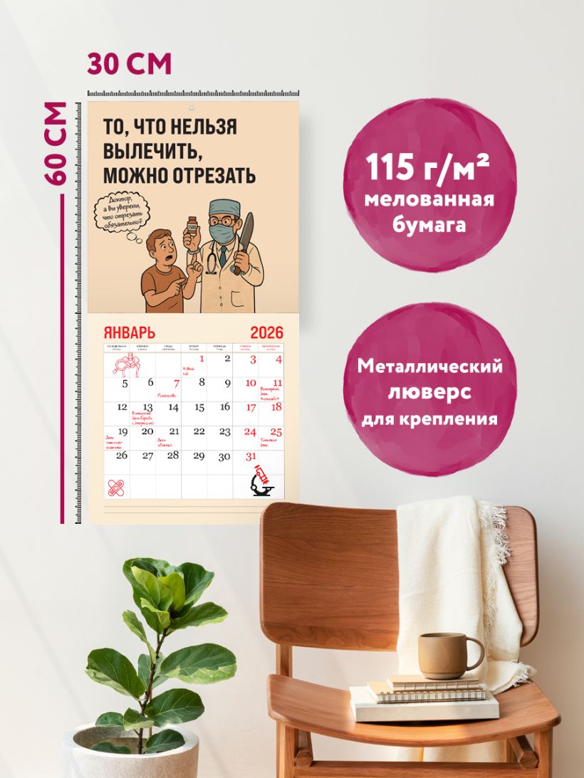 Календарь врача на 2026 год — это ироничный подарок для врачей, который поднимет настроение даже после самого тяжелого приема. Смешные рисунки и календарная сетка с праздниками и превращают его в идеальное украшение кабинета. Вы можете заказать его, чтобы повесить на стену своего кабинета или подарить коллегам по работе. Он создан специально для тех, кто точно знает что смех — лучшее лекарство!