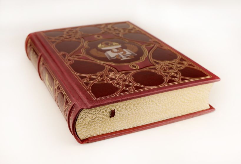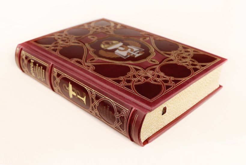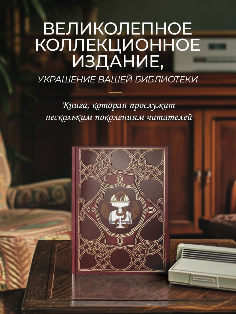 Книга в коллекционном переплёте ручной работы, созданном по технологиям 19 века из кожи натурального дубления цвета бордо. Переплёт украшен по авторским рисункам золотым, серебряным, красочным и рельефным тиснением. Обрез окрашен, торшонирован и вызолочен вручную. Каптал и ляссе (ленточка для закладывания страниц) изготовлены из шелка. Книга отпечатана на легкой матовой бумаге. Книга в орнаментированном переплете будет великолепно смотреться на любой полке и украсит собой интерьер кабинета и библиотеки. Сертификат, подтверждающий уникальность коллекционного переплета вложен в каждый экземпляр и пронумерован.