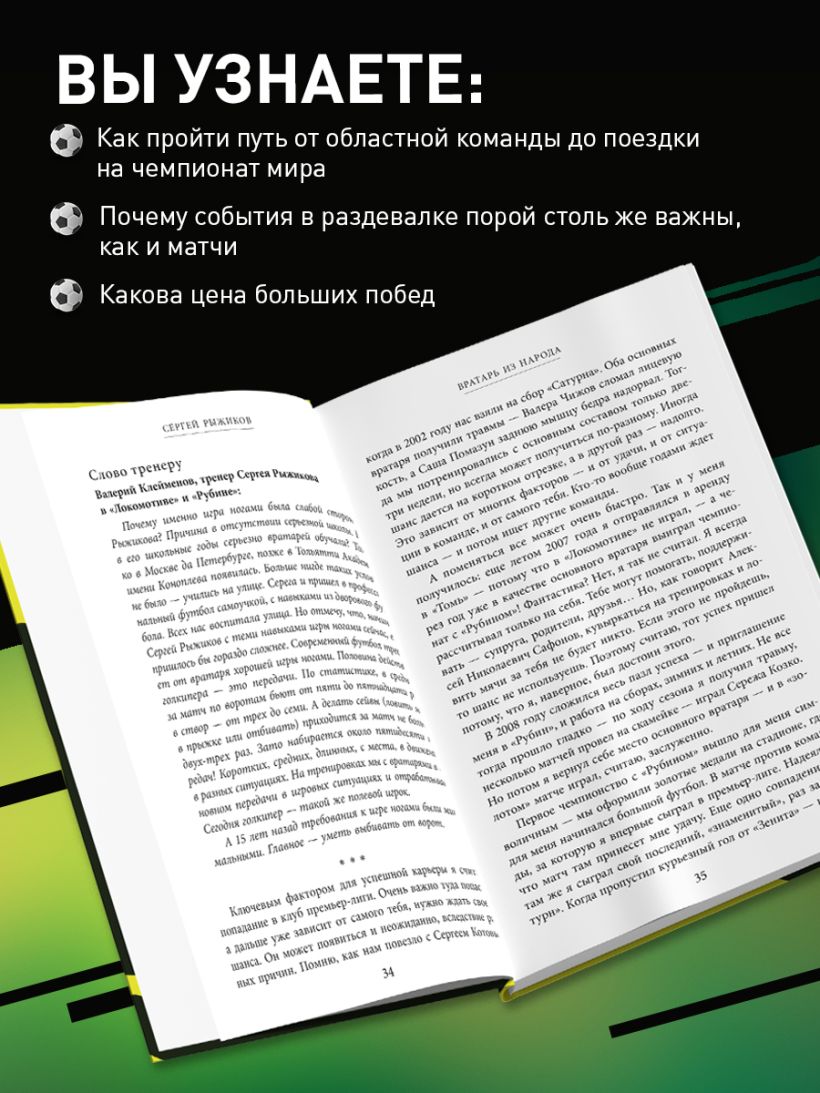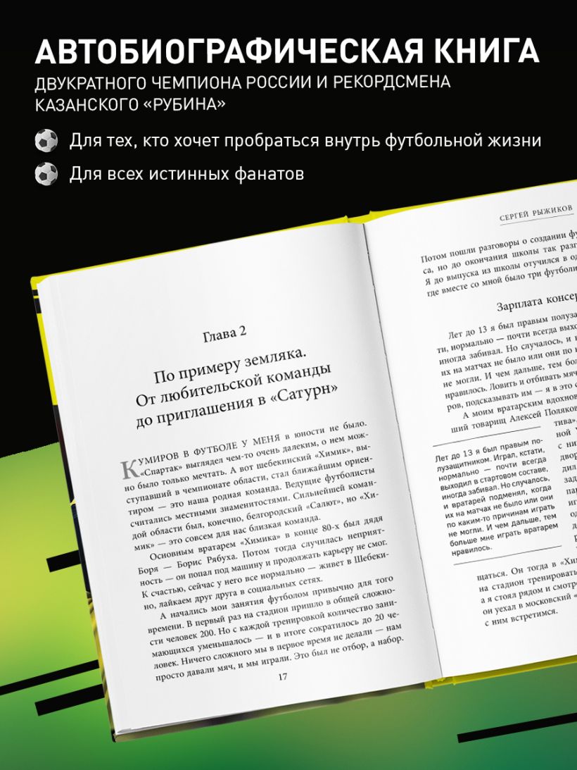 В футболе возможно всё! Автобиографическая книга двукратного чемпиона России и рекордсмена казанского «Рубина» рассказывает о пути, который Сергей Рыжиков прошел от областной команды до поездки на чемпионат мира, от запасного до награды из рук президента республики. Как это стало возможным и какой оказалась цена преодоления?