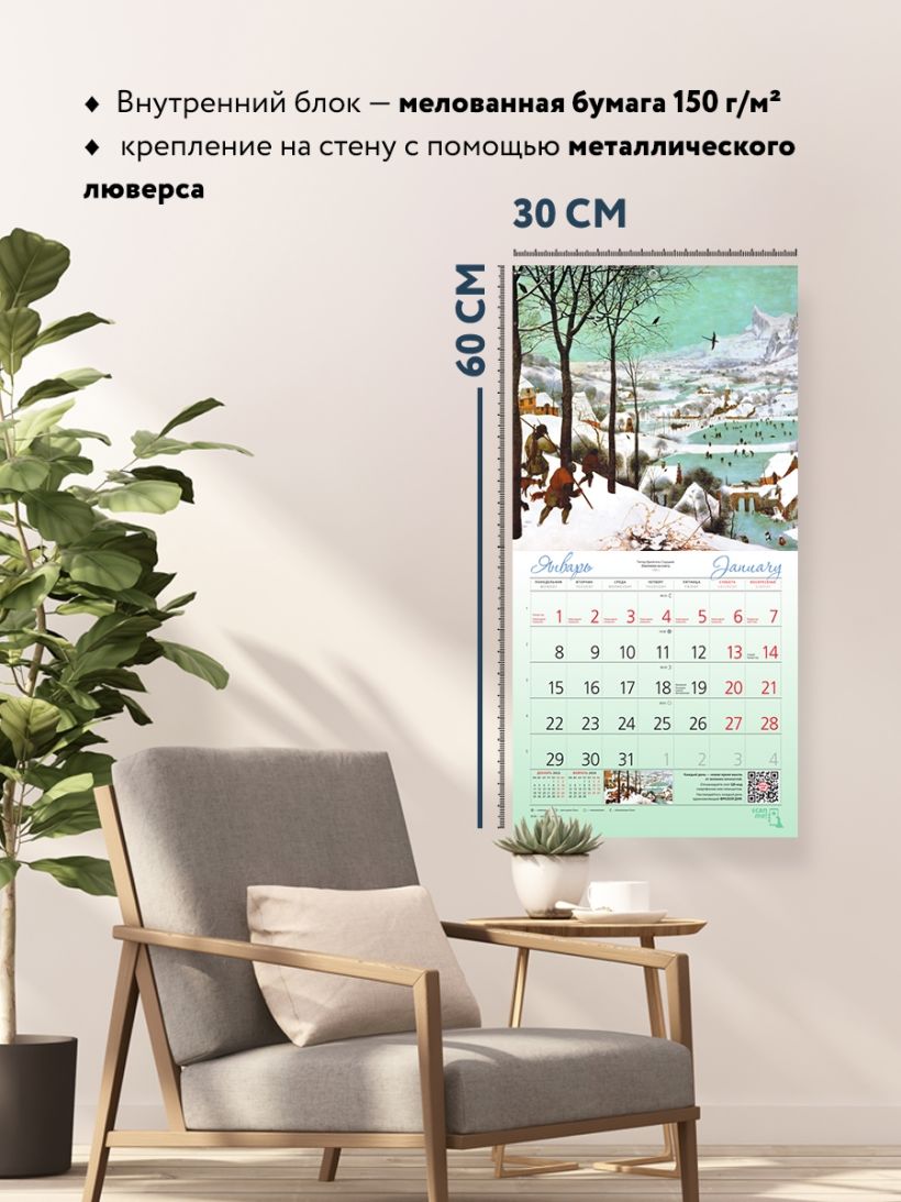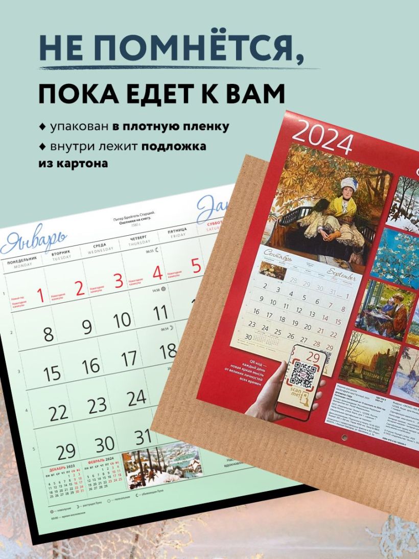 В этом настенном перекидном календаре на 2024 год представлены знаменитые картины великих художников. Повесьте этот календарь в своем доме или на рабочем месте, и он достойно украсит любой интерьер. А календарный блок напомнит о важных событиях года. В центре календаря помещен большой арт-постер, который может стать отдельным декоративным украшением интерьера.