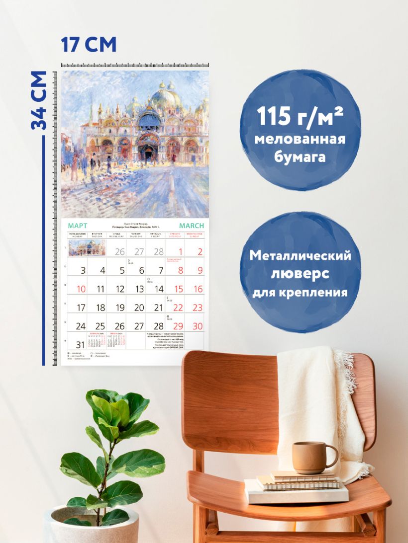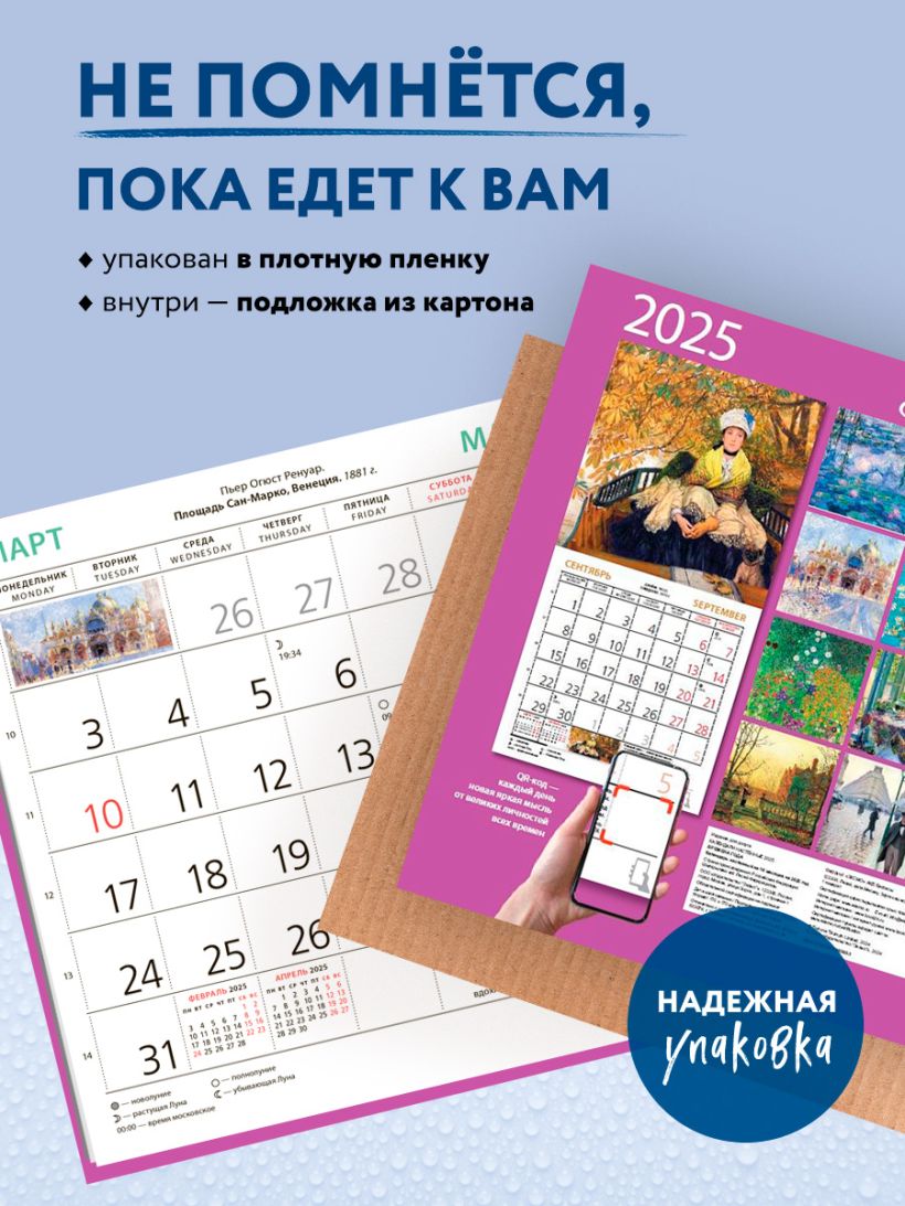 В этом настенном перекидном календаре на 2025 год представлены знаменитые картины великих художников. Повесьте этот календарь в своем доме или на рабочем месте, и он достойно украсит любой интерьер. А календарный блок напомнит о важных событиях года.
