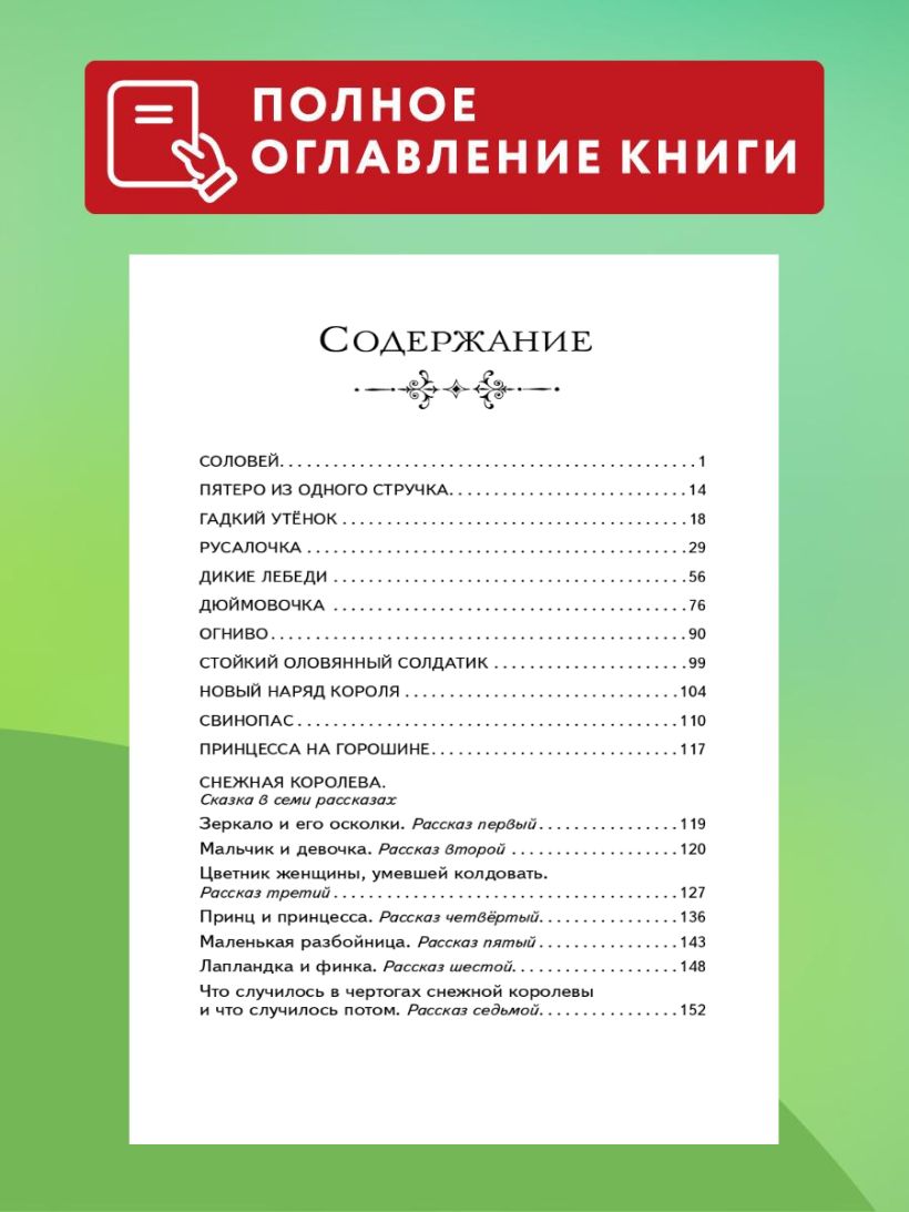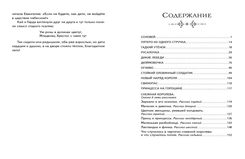 В книгу включены известные произведения Ганса Христиана Андерсена. Среди них история Кая и Герды, чьи сердца оказались неподвластны ледяным осколкам Снежной Королевы благодаря тёплой, искренней дружбе; «Дюймовочка» и «Русалочка», покоряющие читателей трогательными сюжетами об умении справляться с трудностями и всегда быть собой; «Гадкий утёнок» и другие сказки.