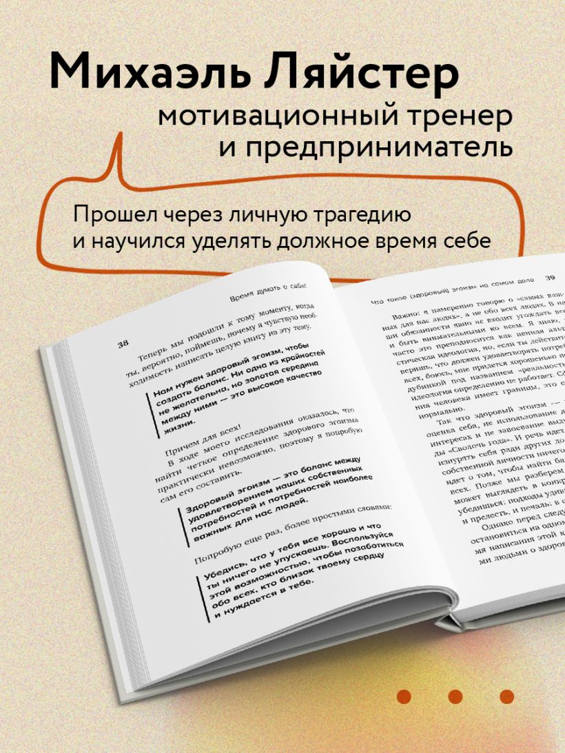 Автор этой книги Михаэль Ляйстер всегда был тем, кто вспоминал о своих потребностях в последнюю очередь. Но после смерти сына он с ужасом обнаружил, что окружающие по привычке ждут от него помощи, вместо того, чтобы поддержать его в трудную минуту. В результате, преодолевая горе, Михаэль создал методику "12 шагов к здоровому эгоизму", а потом поделился ей с сотнями тысяч своих подписчиков. Она помогает перенастроить фокус внимания и откорректировать жизненный сценарий, осознать собственную ценность и обрести уверенность в себе. "Здоровый эгоизм в отличии от нарциссического не отталкивает других людей, а наоборот – делает вас центром притяжения, - пишет Михаэль в своем блоге, - Моя книга учит людей становиться здоровыми эгоистами".