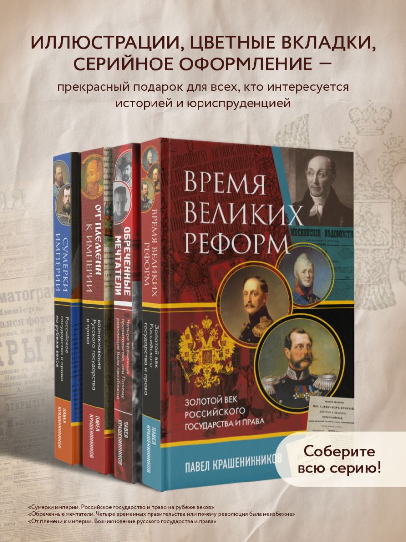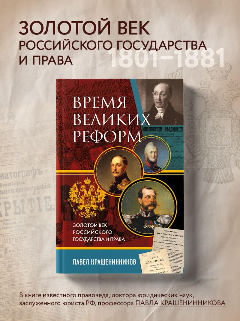 Книга известного российского правоведа, доктора юридических наук, профессора Павла Крашенинникова «Время великих реформ. Золотой век российского государства и права» охватывает период со вступления на престол императора Александра I в 1801 году до начала правления императора Александра III в 1881 году.