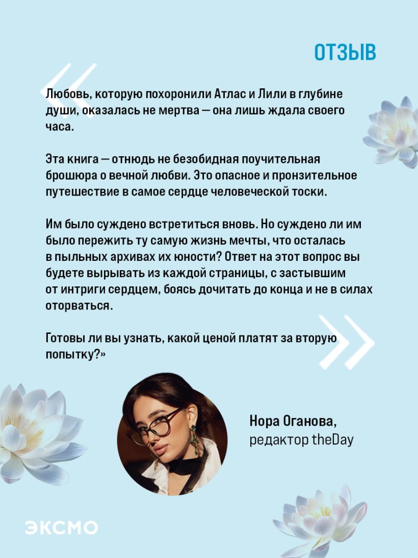 «Любовь, которую похоронили Атлас и Лили в глубине души, оказалась не мертва — она лишь ждала своего часа». — Нора Оганова, редактор theDay