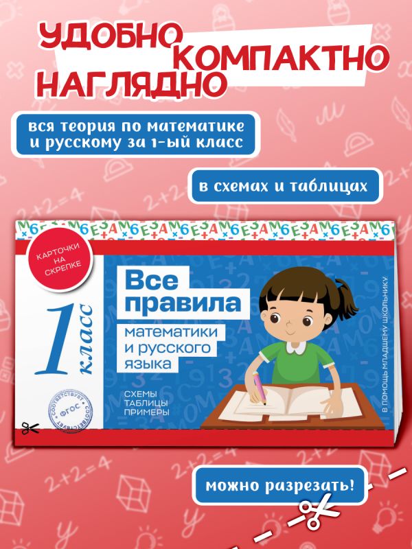 В пособии собраны все основные правила русского языка и математики за 1 класс. Карточки на скрепке способствуют закреплению знаний, полученных на уроках в начальной школе. Порядок тем соответствует школьной программе. Все правила изложены наглядно и доступно, а примеры и иллюстрации помогут школьникам лучше усвоить материал.