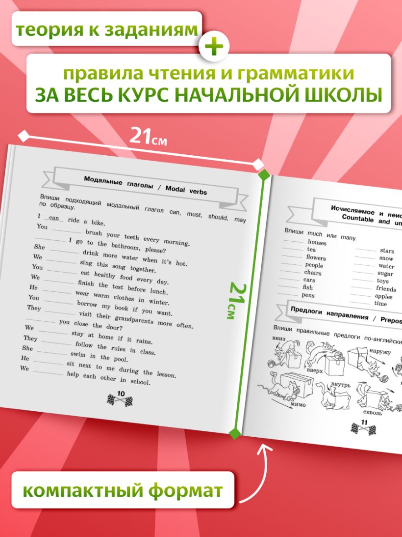 Справочник для учеников 1, 2, 3 и 4 класса — это универсальный помощник для изучения и закрепления всех правил по английскому языку за курс начальной школы. Эта книга станет незаменимым инструментом для школьников, их родителей и педагогов. Благодаря наглядным схемам, таблицам, картам памяти и иллюстрациям справочник поможет легко усвоить программу и подготовиться к контрольным работам, самостоятельным заданиям и итоговым тестам, включая ВПР. Правила английского языка объясняются в лёгкой и доступной форме, что позволяет ученикам начальной школы лучше усваивать информацию. На каждый конкретный вопрос даётся понятный и исчерпывающий ответ. В конце сборника помещён список неправильных глаголов за курс начальной школы, который станет удобной шпаргалкой для подготовки к урокам. Справочник разработан в полном соответствии с требованиями ФГОС начального общего образования. Это прекрасный подарок детям на 1 сентября, который поможет им успешно справляться с домашними заданиями и освоить программу английского языка. Книга полезна не только ученикам начальной школы, но и их родителям, желающим помочь с выполнением домашних заданий, а также педагогам, стремящимся сделать уроки английского языка более наглядными и интересными. Этот универсальный справочник — отличный помощник для подготовки к ВПР, контрольным и самостоятельным работам!
