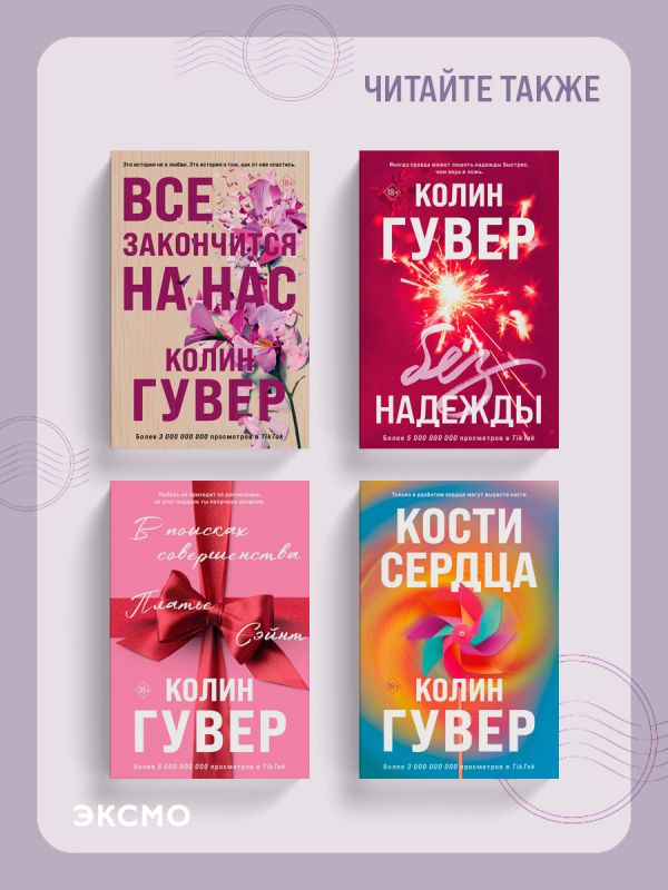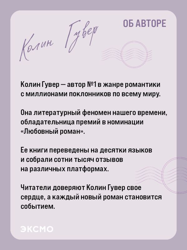 Колин Гувер – литературный феномен нашего времени, троекратная обладательница премии Goodreads Choice Award в номинации «любовный роман». Ее произведения переведены на десятки языков. Она – мировой тренд. Продажи книг Колин Гувер превысили продажи Стивена Кинга и Джорджа Мартина.