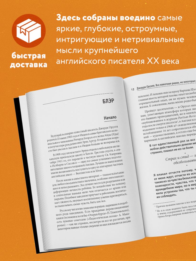 Даже у лучших писателей не все тексты одинаково хороши. Большинство классиков известны нам одной-двумя книгами. Но встречаются исключения и из этого правила. Одно из величайших — творчество Джорджа Оруэлла, автора знаменитого романа-антиутопии «1984». Практически все, что вышло из-под его пера, актуально и сегодня, через 70 лет после того, как он поставил последнюю точку. В этой книге впервые в отечественном книгоиздании собраны воедино самые яркие, глубокие, остроумные, интригующие и нетривиальные мысли крупнейшего английского писателя ХХ века.
