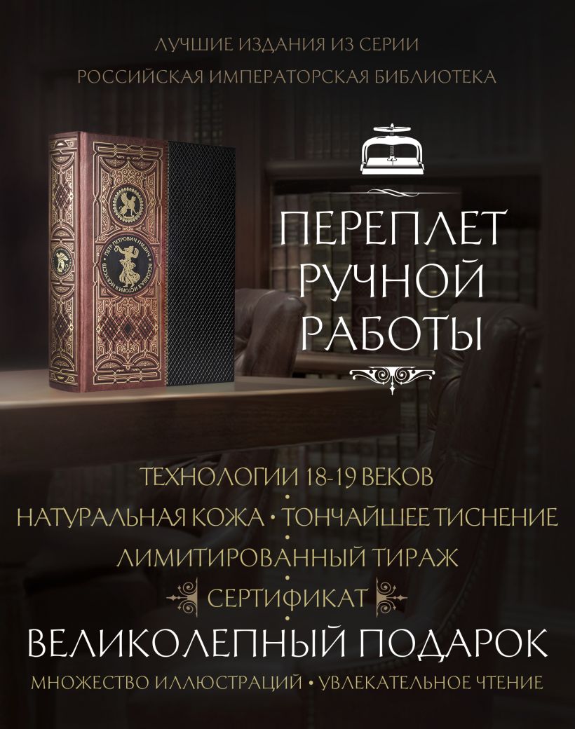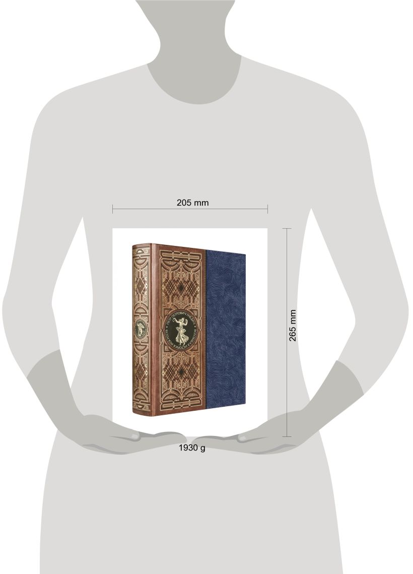 Книга в коллекционном инкрустированном переплёте. Переплет изготовлен их двух видов натуральной кожи по технологии 19 века и украшен сплошным тончайшим тиснением, в полном соответствии с лучшими образцами переплетов европейских мастеров. Использовано 3 вида тиснения — золото,черный натуральный пигмент и рельефное тиснение. В оформлении переплета использованы растительно-геометрические орнаменты, благодаря им книга будет отлично смотреться на любой книжной полке. Лента для закладывания страниц и каптал, скрепляющий верх и низ объемного тома, изготовлены из шелка. Бумага в книге легкая, матовая, что обеспечивает комфортное чтение даже длительное время, цветные иллюстрации напечатаны на мелованной бумаге. Обрез книги окрашен, торшонирован и вызолочен вручную. К книге прилагается сертификат, подтверждающий уникальность издания, он вложен в каждый экземпляр и пронумерован вручную.