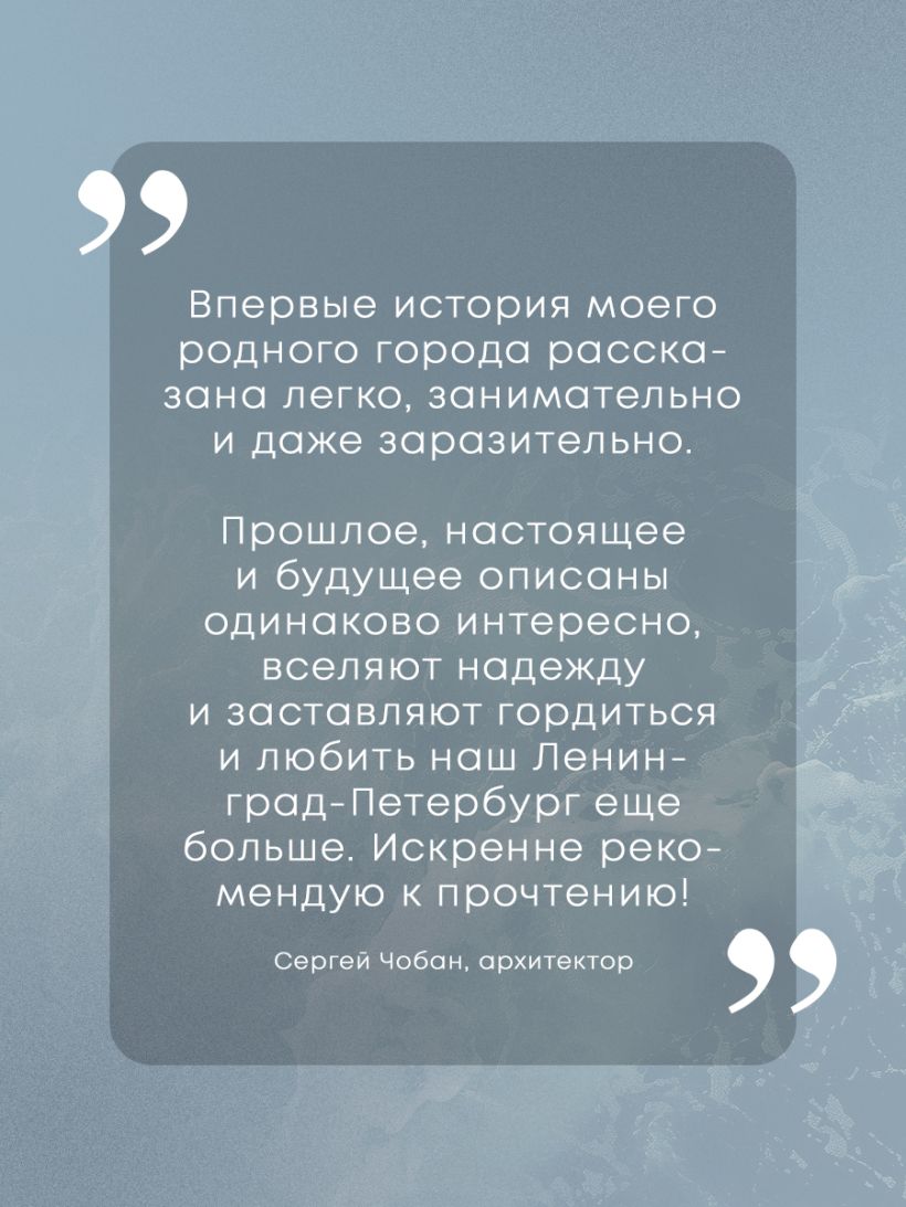 «Впервые история моего родного и любимого города рассказана легко, занимательно и даже заразительно. Прошлое, настоящее и будущее описаны одинаково интересно, вселяют надежду и заставляют гордиться и любить наш Ленинград-Петербург еще больше. Искренне рекомендую к прочтению!» — Сергей Чобан, архитектор