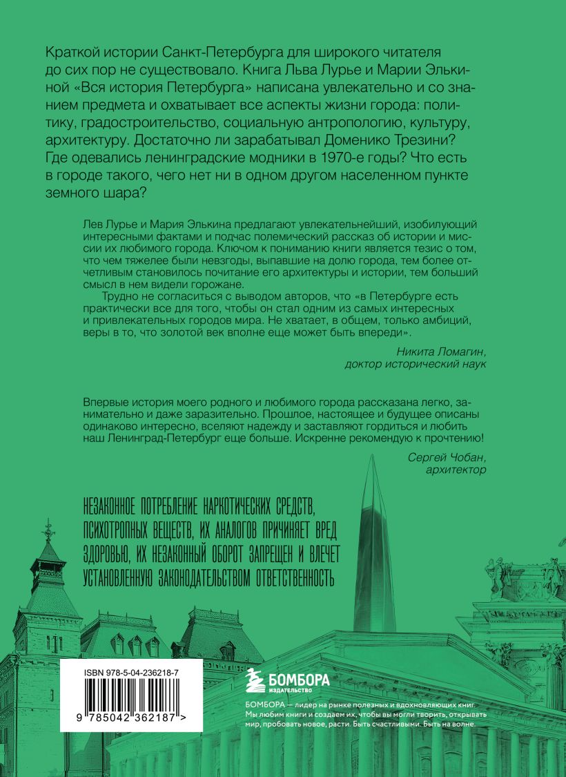 "Вся история Петербурга. От потопа и варягов до Лахта-центра и гастробаров" охватывает все стадии становления города: ранние поселения на берегах Невы, Петербург как столицу империи, индустриализацию XIX века, советский Ленинград и современный многогранный мегаполис. Авторам удалось соединить в общую канву рассказ о политических событиях и преобразованиях, важных культурных вехах и социальных явлениях, с одной стороны, и о градостроительных решениях и архитектурных стилях – с другой. "Вся история Петербурга" написана легко, и в то же время она представляет вдумчивый взгляд на город, позволяющий делать выводы не только о его прошлом, но и возможном будущем.
