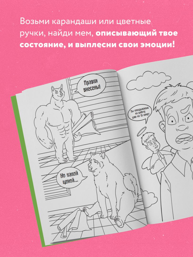 Перед тобой необычная раскраска-антистресс! Если тебя достали коллеги и хочется расслабиться после рабочего дня, то эта раскраска прекрасно подойдет! Возьми свои любимые карандаши или цветные ручки, найди мем, наиболее полно описывающий твое состояние, и выплесни свои эмоции! Отвлекись от внешнего мира, раскрашивая динозавриков, лягушек и котиков в жизненных ситуациях из известных мемов!