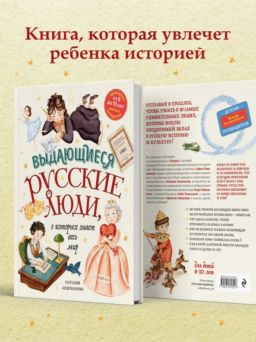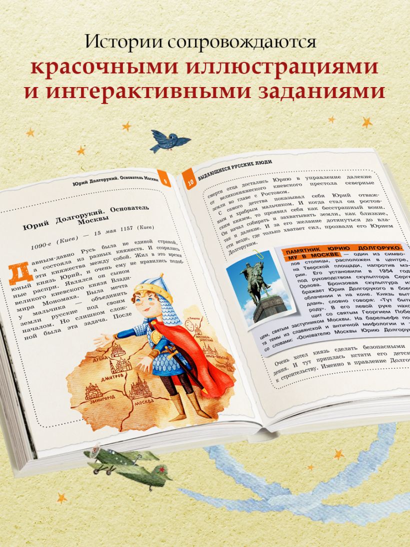 Отправляйтесь в захватывающее путешествие по разным эпохам нашей страны! Вы хотите познакомить вашего ребёнка с известными людьми России — Петром I и Суворовым, Пушкиным и Чайковским, Ломоносовым и Гагариным? Узнать, во что играли будущие исторические личности? Чем увлекались в детстве? Как искали свою судьбу, искали себя на нелёгких жизненных дорогах? Ведь они так же, как и все мы, одолевали за партой неподдающиеся науки, отстаивали собственное мнение в спорах; у них были свои детские огорчения и радости. И далеко не всё получалось с первого раза... Тогда открывайте эту книгу! В каждом из 20 биографических рассказов, адаптированных для детей 7—10 лет, — невероятный образец силы воли и стойкости характера, мотивирующий ребят на собственные свершения. Их сопровождают красочные полосные иллюстрации и занимательные факты, чтобы знакомиться с выдающимися соотечественниками было наглядно и увлекательно. А ещё это неповторимый подарок для всех, кто гордится историей и культурой своего Отечества! Книги серии получили заслуженно высокую оценку — в 2024 году они были номинированы на премию Российского общества «Знание» в категории «Лучшая просветительская книга».
