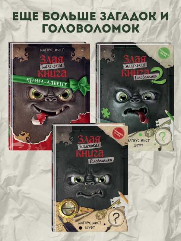 Первая книга международной серии-бестселлера — только в России продано более 600 000 экземпляров! Уникальный формат, сочетающий художественный текст + квест + разнообразные задания для читателей = книга-квест. Это издание создано для тех, кто считает, что читать — это скучно. Оно не оставит никаких сомнений, что с книгами можно классно проводить время: подтверждено тысячами положительных отзывов родителей! Секрет успеха серии в том, что книга ведёт живой, юмористический диалог с читателем, рассказывает ему страшные истории и приглашает в авантюрное приключение. Чтобы пройти всю книгу до конца (принимая решения на сюжетных развилках и переходя по разным страницам не по порядку), нужно разгадать немало загадок и головоломок, которые развивают внимание и мышление. Поэтому «Маленькой злой книге», которая хочет стать самой злой книгой на свете, без помощи читателя никак не обойтись! Книга-игра содержит множество атмосферных цветных иллюстраций и красивые шрифты, и понравится детям 7—11 лет. Тома серии можно читать в любой последовательности. Ещё выпущены специальные издания «Читай с друзьями», «Головоломки» и «Адвент», а также подсерия для подростков 11—13 лет «Злая книга».