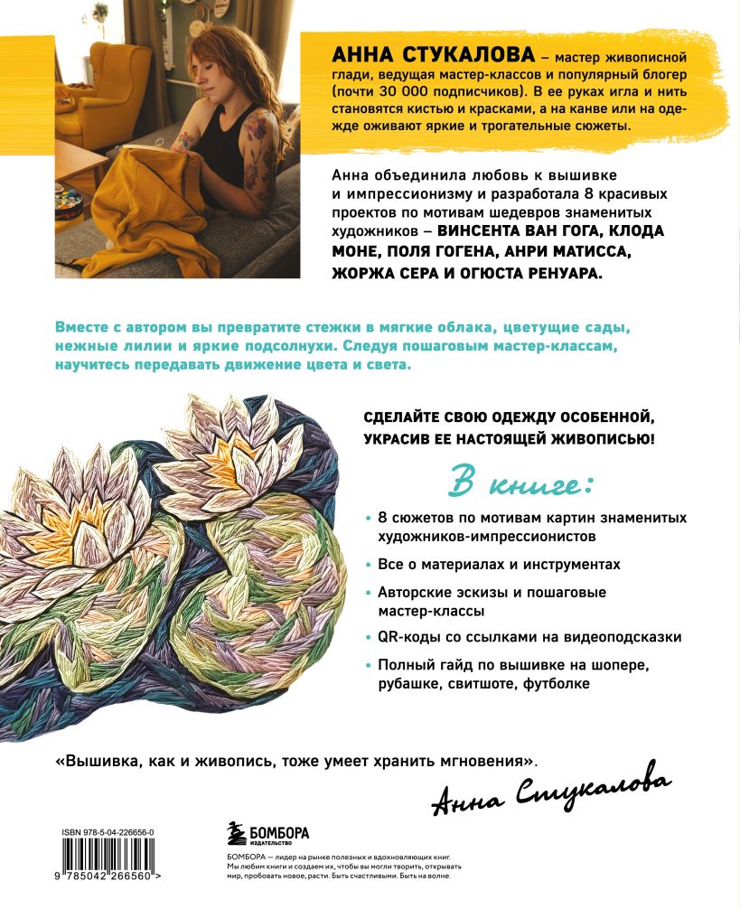 Анна Стукалова – мастер живописной глади, ведущая мастер-классов и популярный блогер. В ее руках игла и нить становятся кистью и красками, а на канве или на одежде оживают яркие и трогательные сюжеты. В этой книге вы найдете 8 красивых проектов по мотива шедевров знаменитых художников - импрессионистов. По пошаговым мастер-классам вы научитесь превращать стежки в мягкие облака, цветущие сады, нежные лилии и яркие подсолнухи. Украшайте аксессуары и одежду настоящей живописью, передавая движение цвета и света.