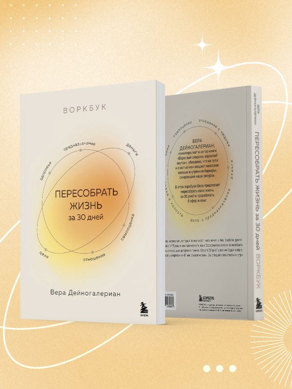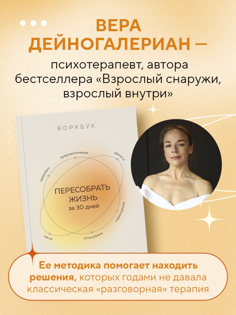 Вера Дейногалериан, психотерапевт и автор книги «Взрослый снаружи, взрослый внутри» убеждена, что на пути к счастью нам мешают неосознаваемые внутренние барьеры, сжирающие наши ресурсы. В этом воркбуке Вера предлагает пересобрать свою жизнь за 30 дней и проработать 6 сфер жизни: цели, самооценка, отношения с людьми, здоровье и красота, дело и предназначение, деньги.