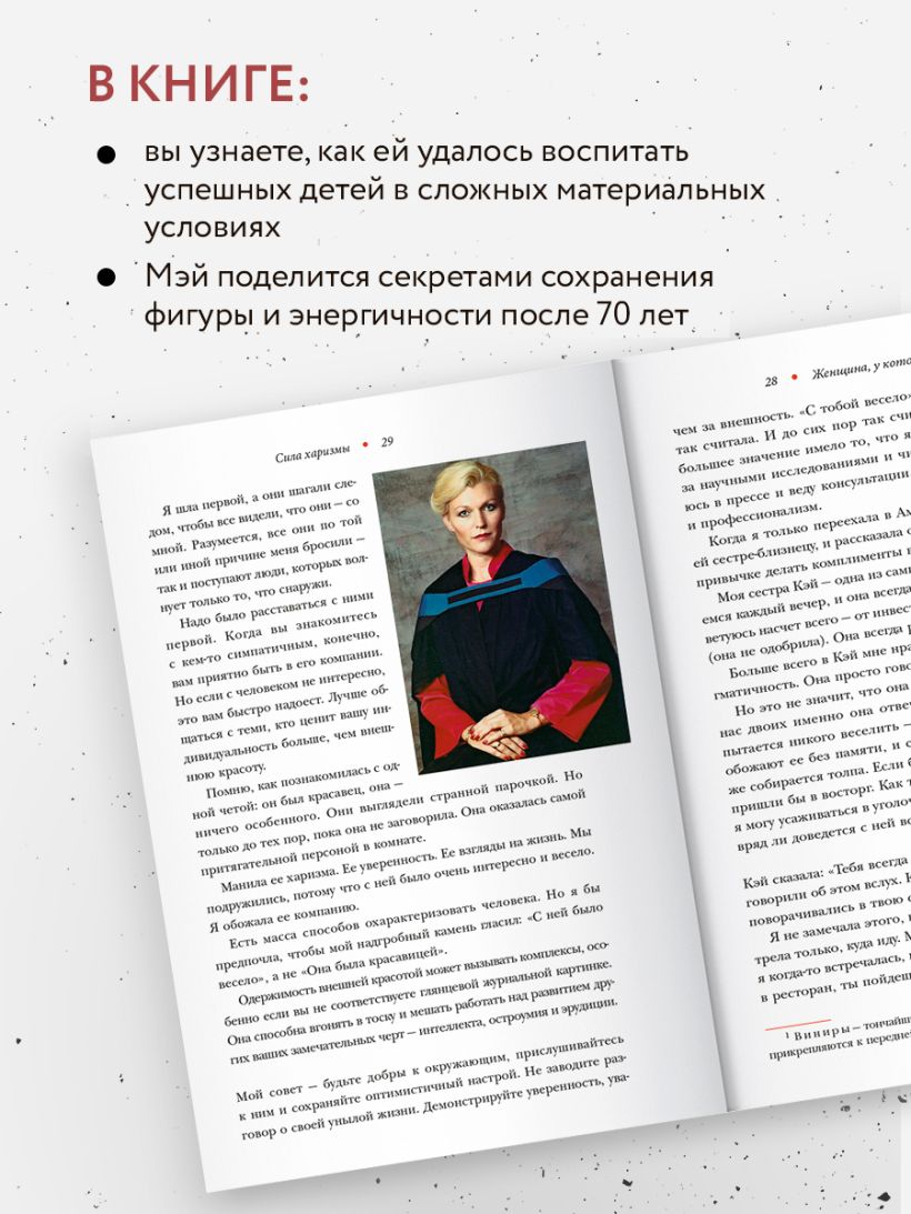 В своей книге автор поделится и чисто женскими очень важными советами: о поддержании здоровья, продлении естественной красоты, даст уроки стиля и подскажет, как быть хорошей мамой и не распрощаться с карьерой, и самое важное, расскажет о принятии себя, о том, что жизнь хороша и открыта новому в любом возрасте.