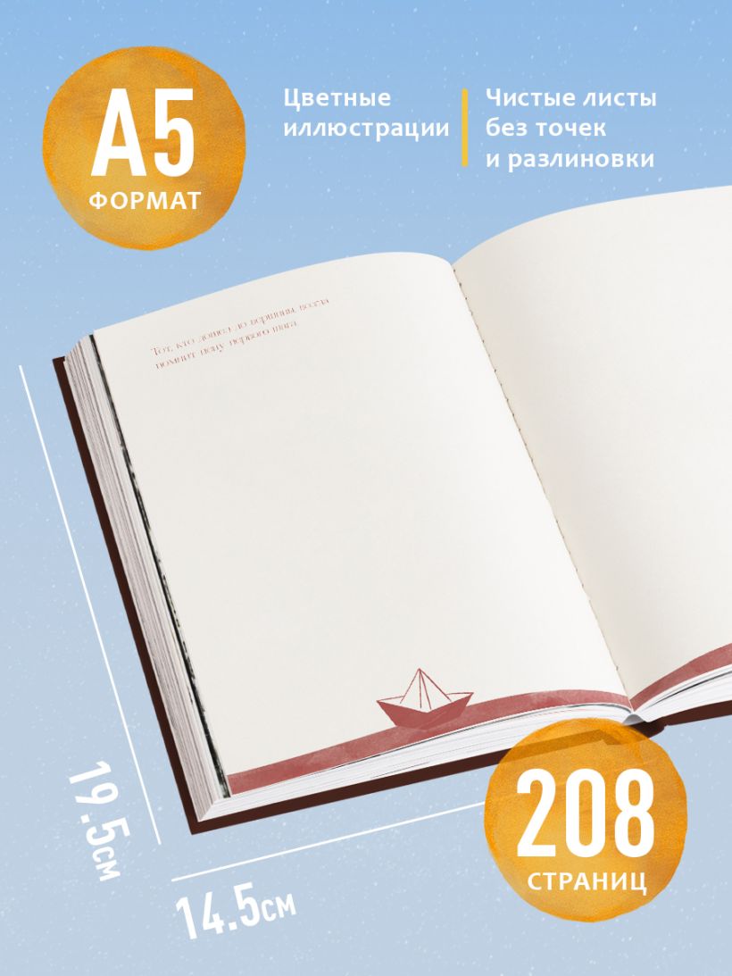 Блокнот формата А5. Внутри — 208 страниц белой бумаги плотностью 80 г/м².