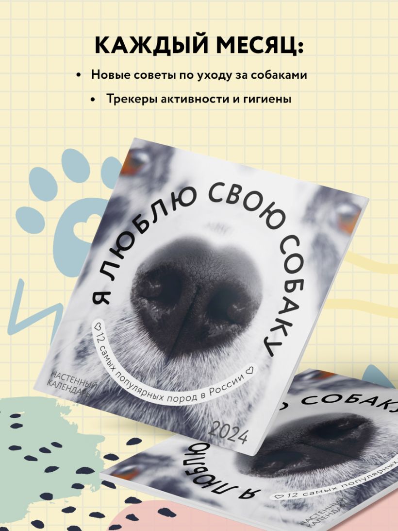 На каждом развороте фотография няшной собаки и один интересный факт из истории породы. В каждом месяце по одному совету по уходу за собакой. В сетке — трекеры активности и гигиены.