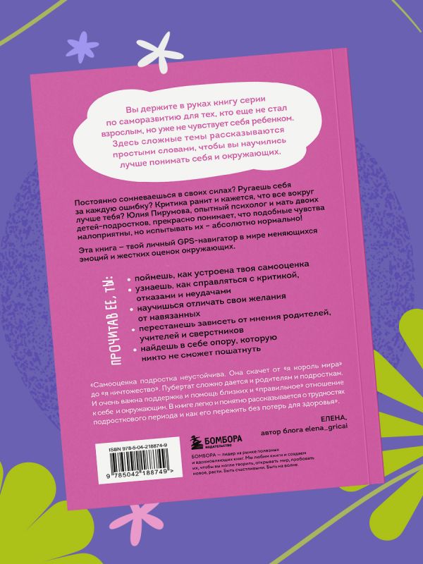 Пубертат сложно дается и родителям и подросткам. И очень важна поддержка и помощь близких и "правильное" отношение к себе и окружающим. В книга легко и понятно рассказывается о трудностях подросткового периода и как его пережить без потерь для здоровья. Эту книгу нужно прочитать и подросткам и их родителям». — Елена, автор блога elena_gricai
