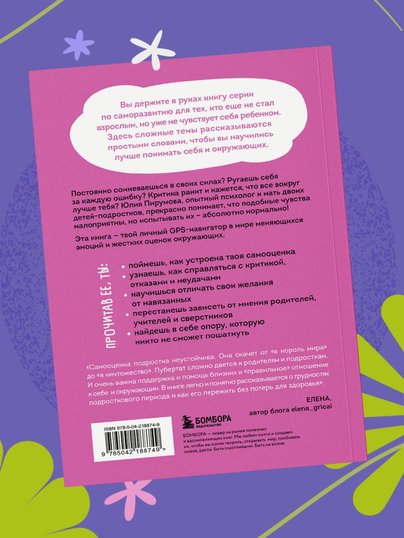 Эта книга — твой личный GPS-навигатор в мире меняющихся эмоций и жестких оценок окружающих. Она не будет учить «любить себя всем врагам назло». Вместо этого ты поймешь, как устроена твоя самооценка, откуда берутся эмоциональные качели и как наконец перестать зависеть от чужого мнения. Внутри ты также найдешь чек-листы и упражнения, которые помогут тебе лучше узнать себя и обрести утраченную уверенность.