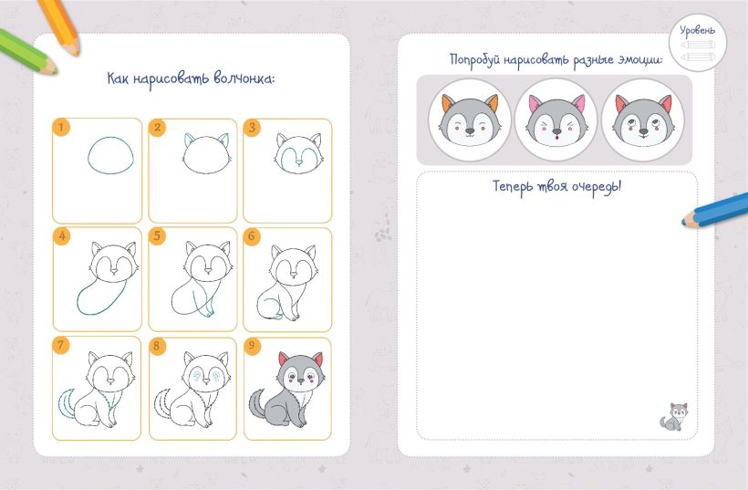 Здесь 30 пошаговых схем рисования и 3 уровня сложности: начинайте с самого лёгкого или выбирайте, что больше нравится. Особенность этой книги — дополнительные выражения мордочек. Вы сможете сделать своих зверят разнообразными и уникальными, меняя их эмоции и окраску.