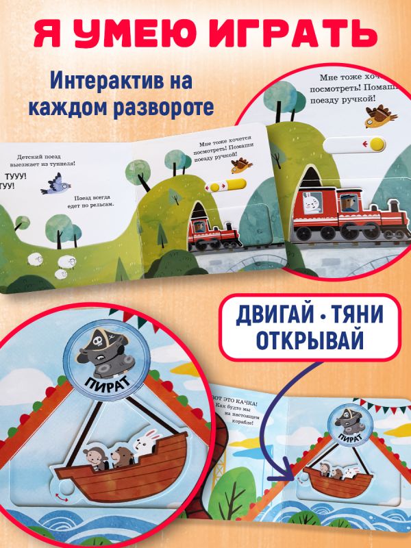 Игра с книгой начинается прямо с обложки, ведь там находится первая подвижная деталь! Яркие простые картинки с весёлыми животными обязательно заинтересуют ребёнка, а интерактивные элементы сделают игру с книгой ещё увлекательнее. Рассматривайте картинки с малышом и придумывайте свои истории!